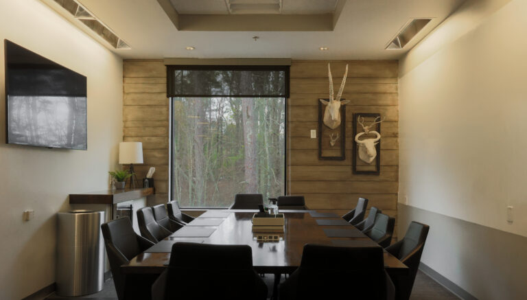 Enjoy a change of scenery in the Retreat. This spacious boardroom offers a wooded view and outdoor-inspired workspace conducive for productivity and collaboration. Wood walls, mounted animal decor and beautiful views are sure to impress your team and clients. Just consider this your in-town company retreat.